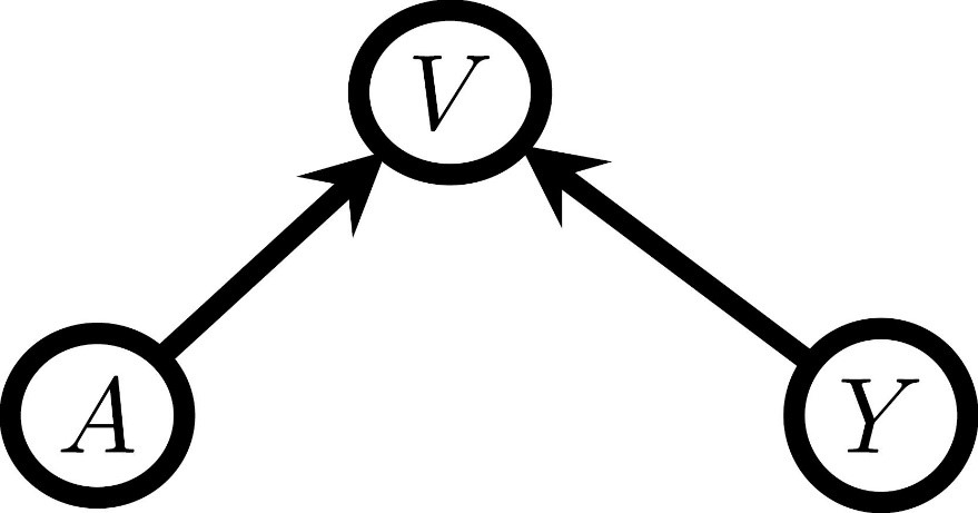 Apart from confounding, spurious correlations can also arise when conditioning on a common cause of the exposure (A) and the outcome of interest (Y). These common causes are called colliders and give rise to a V-structure in causal graphs, as shown in Figure 1. If one would naively adjust for all measured candidate confounders correlated with both the outcome and the exposure, then selection bias is introduced due to the features that are no confounders but colliders and thus also meet this condition. So, one must use expert knowledge to consider what features might be colliders.