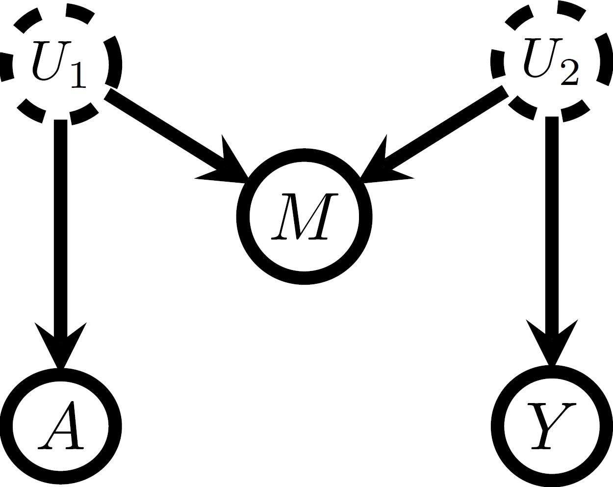 The M-structure has underpinned a longstanding debate in causal inference: “Is it okay to correct for features measured pre-treatment?” [Section 4, 2]. Features measured before treatment can clearly not be colliders in the classical sense since the treatment cannot cause them. However, an underlying M-structure might still exist so that adjustment can result in selection or M-bias.  For example, outcome Y can be lung cancer, treatment A taking selective serotonin reuptake inhibitors, while the measured M indicates whether an individual suffers from coronary artery disease, where M is affected by the unmeasured variables depression status (U_1) and smoking status (U_2) [3]. Without adjusting for M, it would become clear that A does not affect Y, but when adjusting for M, a spurious correlation would be found.