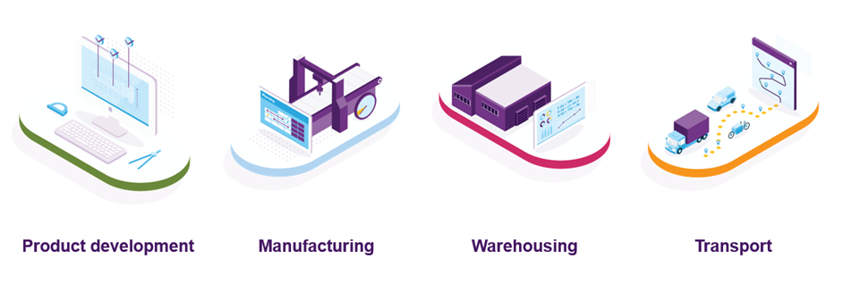Fig. 2: The supply chain of physical goods—from product development through production, warehousing, and transport.