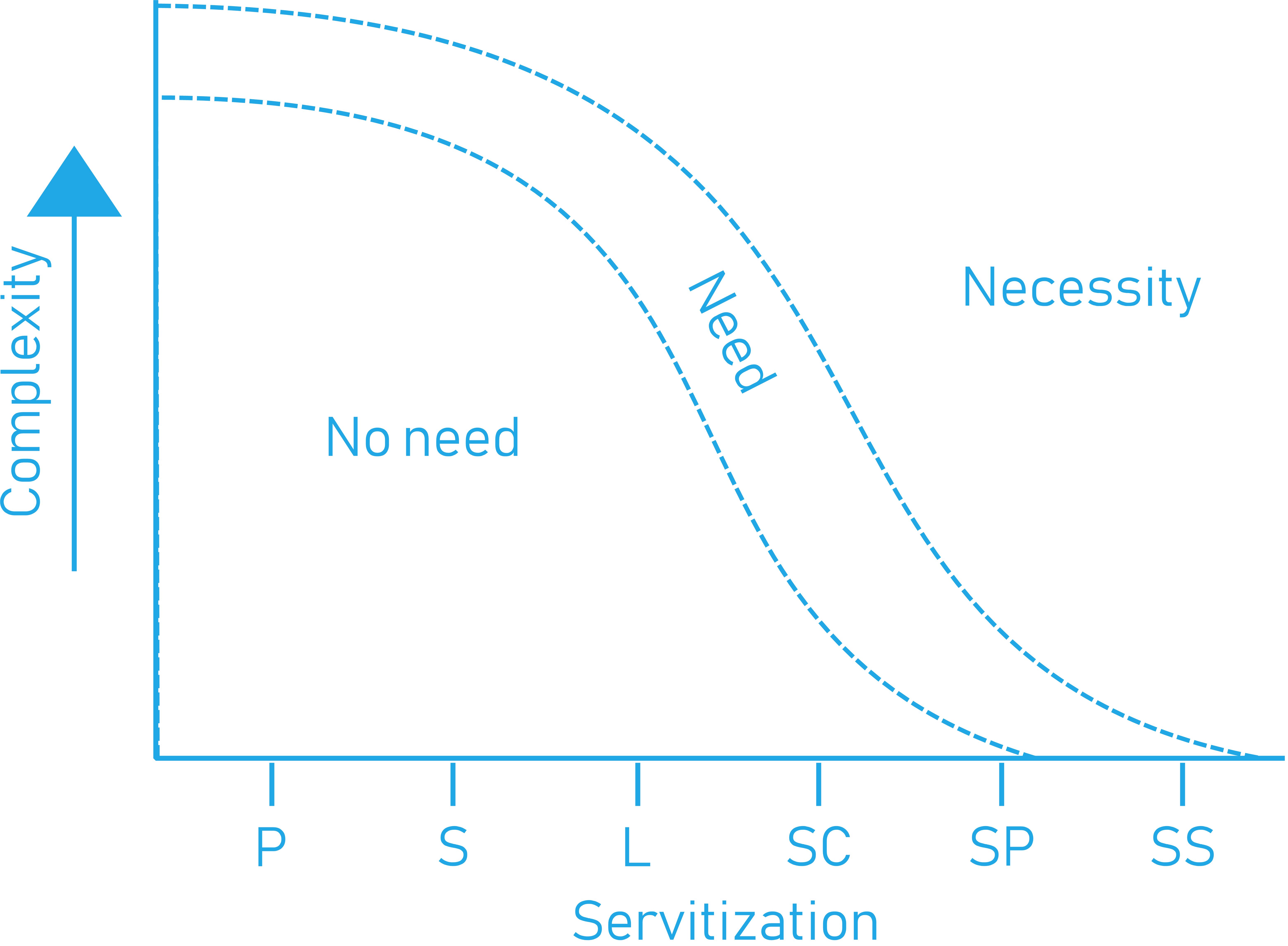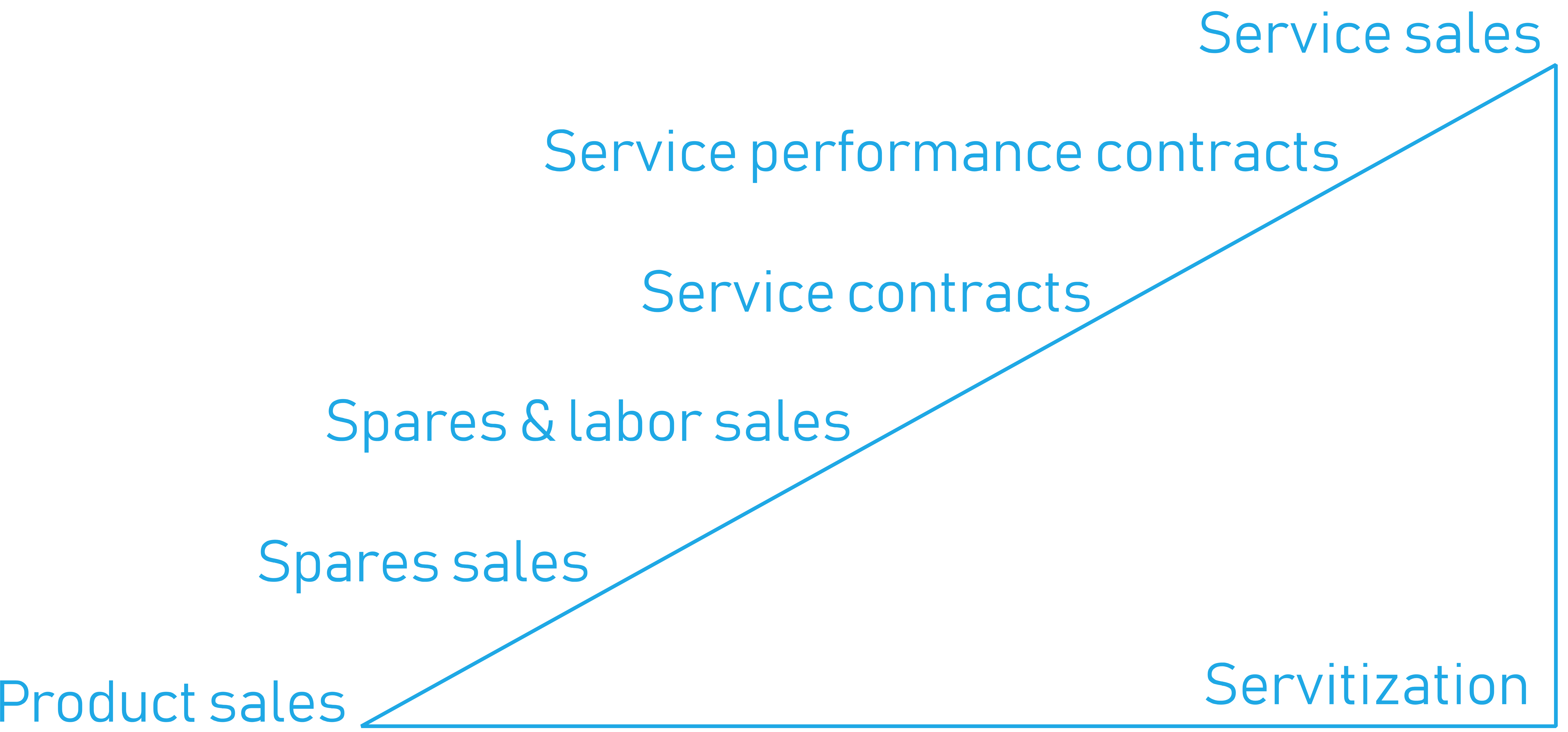 De bovenste helft van de servitization ladder is echter gericht op het leveren van service, waarbij het bedrijf beslist wanneer onderhoud wordt uitgevoerd. Dit zijn vaak de service-aanbieders waarbij meerdere data- en logstieke stromen gemoeid zijn en die dus veelal ingewikkelder in elkaar steken. Bij een service contract bijvoorbeeld worden typisch Service Level Agreements (SLAs) opgenomen, waarbij het bedrijf een boete aan de klant betaalt wanneer de afgesproken service levels niet worden behaald. Bij een service performance contract wordt daarnaast ook een bonus uitgekeerd als het afgesproken service level wordt overschreden door het bedrijf. Service sales is tot slot de meest ultieme vorm van servitization, waarbij niet langer de assets, maar de service als product wordt geleverd. Een voorbeeld hiervan is power-by-the-hour van Rolls Royce, waarbij de machine niet langer als product wordt geleverd, maar als service op locatie staat (het leveren van een uptime machine).