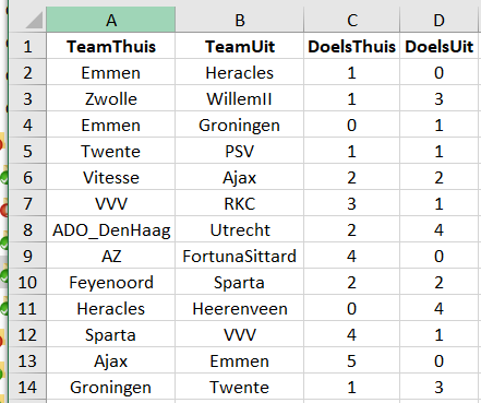 Laten we beginnen met de input voor het model. Die bestaat uit een Excel met 4 kolommen waarin alle reeds gespeelde wedstrijden zijn weergegeven. In Figuur 1 staat een snapshot van de input, welke je vervolgens upload in onze tool.