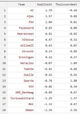 We zien in Tabel 1 dat wanneer alle wedstrijden op neutraal terrein zouden worden afgewerkt, AZ het sterkste zou zijn en Emmen nog net onder RKC zou eindigen. We zien echter dat Ajax en vooral ook Emmen een zeer sterk thuisvoordeel hebben. Dit thuisvoordeel speelt in de helft van de wedstrijden een rol, namelijk alle thuiswedstrijden. Daarmee compenseren Emmen en Ajax hun iets lagere kwaliteitsscore.