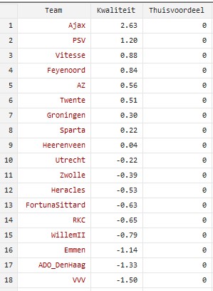 De kwaliteit van een team is het aantal doelpunten verschil waarmee het team gemiddeld zal winnen of verliezen van een gemiddeld team. Hiermee kan ook voor iedere wedstrijd de verwachte uitslag bepaald worden. Voor de wedstrijd Ajax – Twente is die 2 doelpunten verschil in het voordeel van Ajax. Er geldt namelijk dat 2.63 – 0.51 = 2.12 En afgerond is dat dan 2. Maar door het toeval van 1.85 doelpunten per wedstrijd (standaarddeviatie) is een uitslag van 2.12 +/- 2*1.85 ook goed mogelijk. Het verwachte doelpuntenverschil ligt dus waarschijnlijk (95% betrouwbaarheid) tussen [-1.58;5.82], oftewel als Ajax met 6 doelpunten verschil wint of Twente met 2 dan is dat nog niet heel bijzonder.