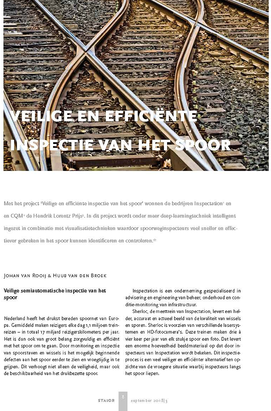 STAtOR is het periodiek van de VVSOR (Nederlandse Vereniging voor Statistiek en Operations Research). In het septembernummer publiceren CQM-consultants Johan van Rooij en Huub van den Broek het project ‘Veilige en efficiënte inspectie van het spoor’, waar we eerder dit jaar ook de Hendrik Lorentz prijs voor in ontvangst mochten nemen. Een interessante publicatie waarin uitgelegd wordt hoe data science en deep learning-technieken daadwerkelijk in de praktijk wordt gebracht.