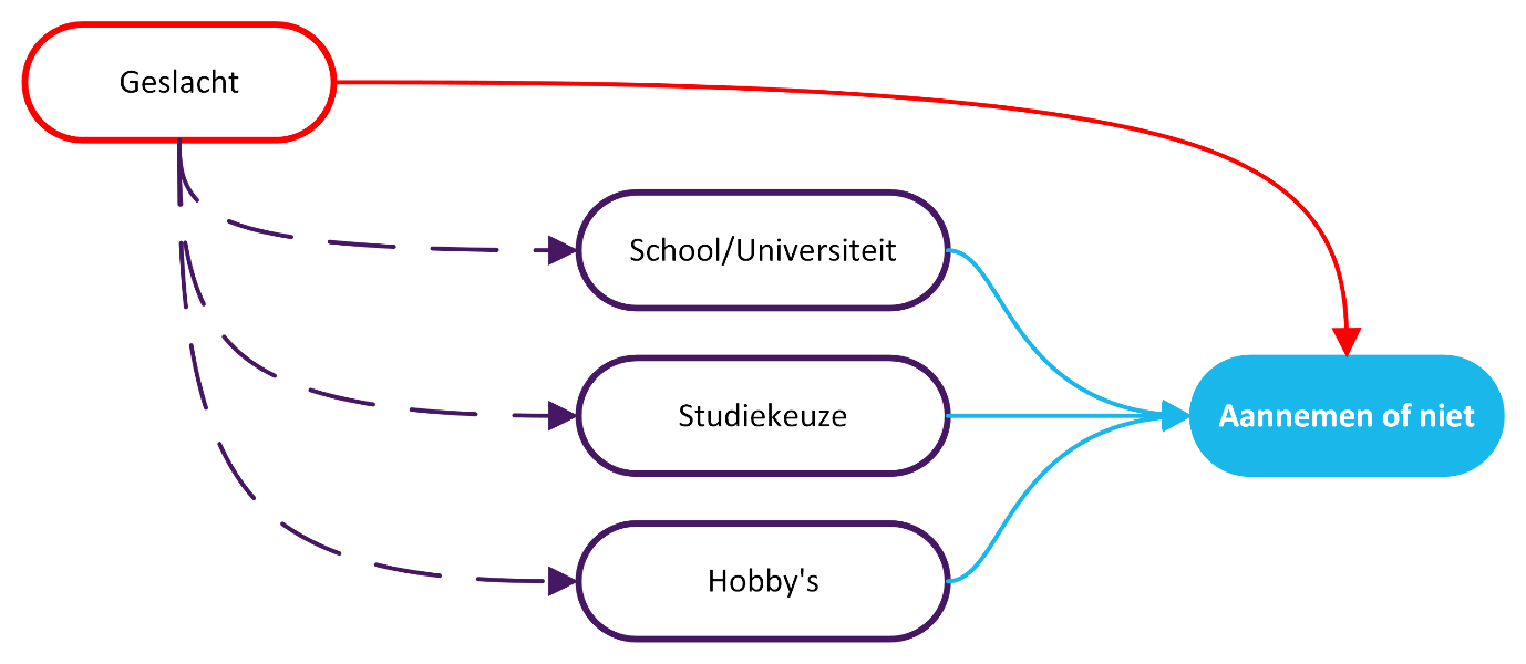 De eerste stap is om een oorzaak-gevolg diagram op te stellen die overeenkomt met het ontstaan van de data. Het diagram hieronder vangt de essentie van het probleem. Het geslacht van een kandidaat had invloed op de beslissing tot aannemen, maar bijvoorbeeld ook op school- en studiekeuze en hobby’s, die op hun beurt weer invloed hadden op deze beslissing. De aanpak van Amazon, het geslacht negeren, komt dus niet overeen met de data. De invloed van geslacht kan in die aanpak niet meer langs de rode lijn stromen, maar zal desondanks via de paarse lijn naar de andere kandidaatseigenschappen stromen en zo toch invloed uitoefenen op de beslissing. Dit fenomeen wordt door statistici een confounder genoemd, en komt in veel vraagstukken voor.