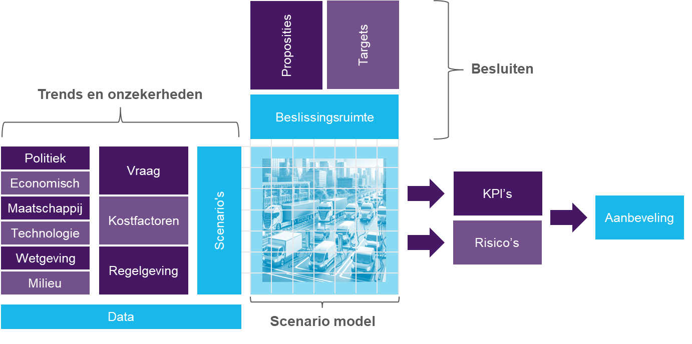 Scenario planning is een strategisch planningsinstrument waarbij mogelijke toekomstige situaties worden geanalyseerd en gesimuleerd om beter voorbereid te zijn op de onvoorspelbare toekomst. Door meerdere scenario’s te onderzoeken kunnen organisaties de impact van verschillende trends en onzekerheden inschatten en doorrekenen, om zo betere en resultaatgerichte beslissingen te nemen. Dit maakt een gerichte investering in de optimale samenstelling van je wagenpark en de bijbehorende laadinfrastructuur mogelijk, terwijl tegelijkertijd het risico wordt verkleind op investeringen die weinig tot geen toegevoegde waarde bieden voor je langetermijndoelstellingen.