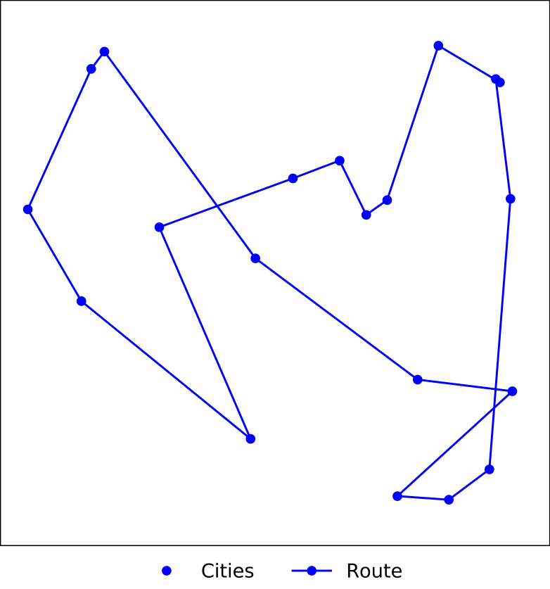 Er is dus een handelaar die vanuit zijn woonplaats een aantal steden wil bezoeken om zijn spullen te verkopen en aan het eind van de dag wil de handelaar weer terugkomen in zijn woonplaats. Een voorbeeld van een handelsreizigersprobleem met 20 steden is weergegeven in de afbeelding hieronder. De steden zijn aangegeven met stippen en de route die de handelsreiziger aflegt is aangegeven met de rechte verbindingslijnen tussen de steden.