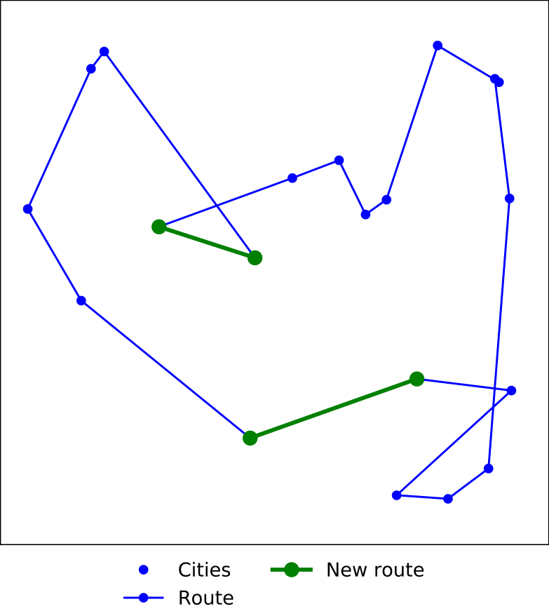 In totaal kunnen er voor dit probleem op ongeveer 400 manieren twee verbindingen worden weggehaald en twee nieuwe verbindingen worden toegevoegd. Dit is ongeveer gelijk aan het aantal steden in het kwadraat. Het aantal mogelijke 2-opt verbeteringen stijgt dus sterk als het aantal steden groter wordt. Hierdoor wordt het vinden van een goede 2-opt verbetering steeds tijdrovender als het aantal steden groter wordt. Tijdens mijn afstudeerstage heb ik Deep Learning gebruikt om een minder tijdrovende manier de beste 2-opt verbetering te selecteren.