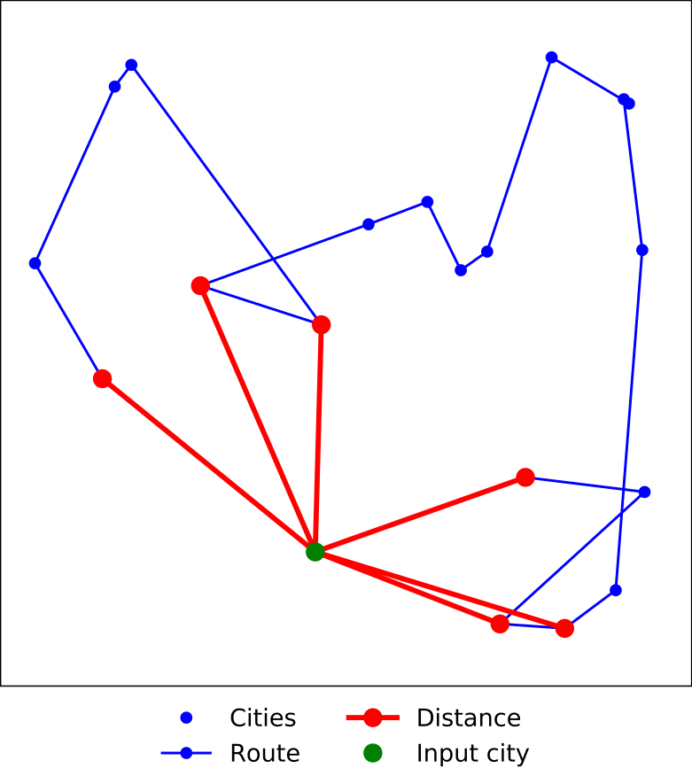 De afbeelding hieronder laat voor een stad (in het groen) de 6 dichtstbijzijnde steden zien.