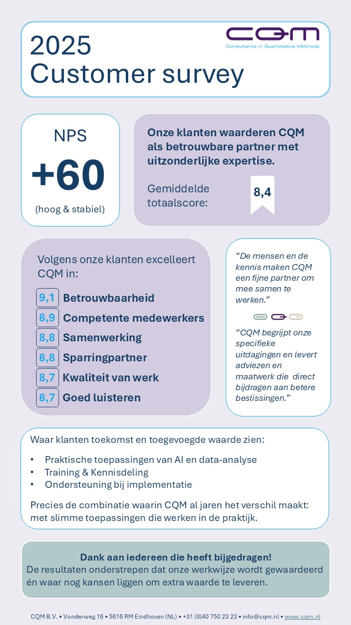 Ook dit jaar hebben we onze klanten gevraagd hoe zij de samenwerking met CQM ervaren. De uitkomsten van het klantonderzoek onderstrepen waar onze kracht ligt: betrouwbaarheid, expertise en het leveren van oplossingen die écht werken.