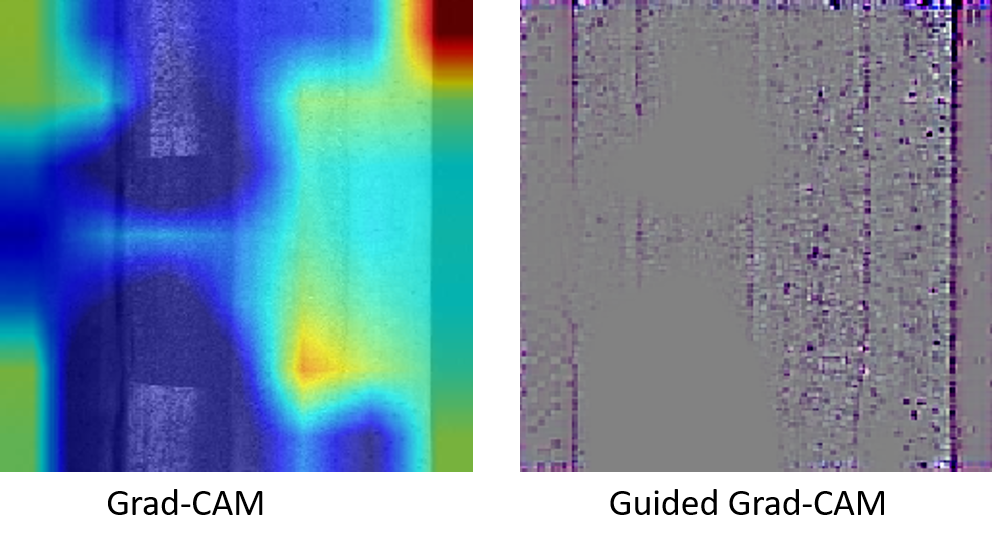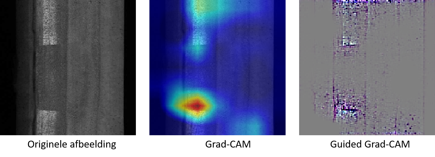 In het onderstaande voorbeeld kreeg een netwerk de taak om thermietlaslijnen van een treinspoor te herkennen. Voor de visualisatie zijn verschillende technieken gebruikt: Grad-CAM en Guided Grad-CAM. De heatmap van Grad-CAM geeft aan in hoeverre het netwerk bepaalde (gebieden van) pixels belangrijk acht voor de geleverde voorspelling. Hoe ‘heter’ de pixels, hoe belangrijker de pixels waren om tot de gegeven conclusie te komen. Guided Grad-CAM geeft binnen de gebieden van Grad-CAM een nauwkeurigere indicatie van belangrijke pixels aan. Hierdoor was te zien dat de thermietlaslijnen door het netwerk juist werden gevonden.
