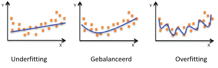 Toch kan het voorkomen dat sommige statistieken positief uitslaan terwijl het neurale netwerk slecht zou presteren in de praktijk. Dat kan worden veroorzaakt door problemen zoals het zogenoemde overfitting of underfitting, wat meestal een gevolg is van het gebruik van een ontoereikende dataset of een netwerkstructuur die niet in staat is genoeg belangrijke kenmerken van de input te leren. De volgende afbeelding geeft een voorbeeld van een functie die aan deze problemen lijdt: