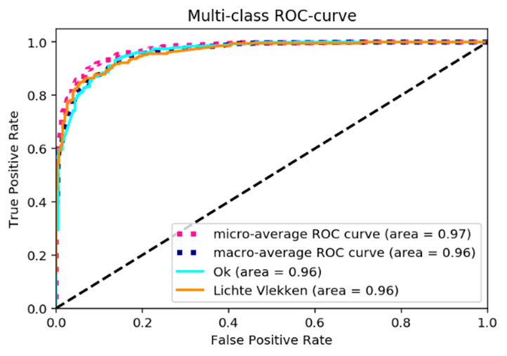 Voorbeeld van typische grafiek voor neurale netwerken: Deze ROC-curve geeft aan hoe goed plaatjes gedetecteerd worden die behoren tot één van twee verschillende categoriëen: “Ok” of “Lichte Vlekken”, in contrast tot willekeurige gokken (de diagonale zwarte lijn).