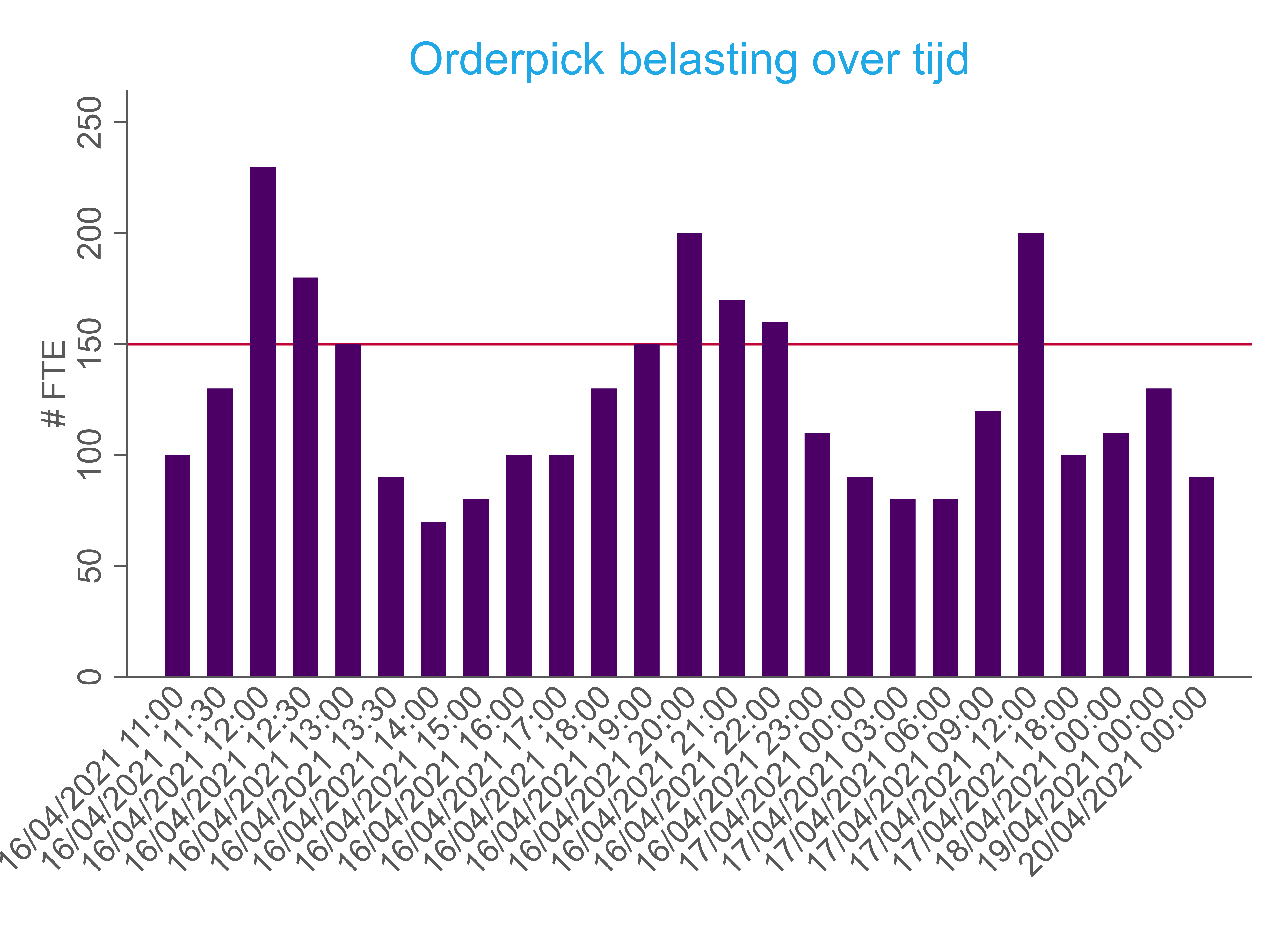 In de vorige stap hebben we laten zien dat het in eerste instantie draait om een goede inschatting te krijgen van de belasting van je processen over tijd. Naast de belasting, heb je natuurlijk ook zicht op de beschikbare capaciteit. In bovenstaand voorbeeld is deze capaciteit simplistisch weergegeven met de rode lijn: We hebben een structurele capaciteit van 150 orderpickers.