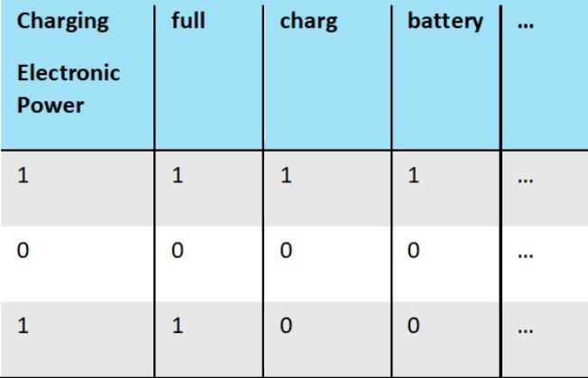 Om te kunnen voorspellen moeten we de vrije tekst in de reviews omschrijven naar nuttige data. We verwachten dat bepaalde woorden in de review inzicht bieden in of een review over een zekere driver gaat of niet. Gebruik van het woord ‘battery’ duidt er bijvoorbeeld op dat de review over ‘Batterijduur’ gaat. Dus, we tellen simpelweg het aantal keer dat elke woord wordt gebruikt. Dit combineren met het rijtje 1-en en 0-en geeft de volgende tabel:
