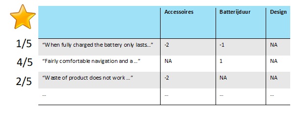 Deze review is eerder gelezen door iemand en ‘geannoteerd’ op de verschillende drivers. In deze review worden twee van deze drivers behandeld, namelijk ‘Batterijduur’ en ‘Accessoires’. Over beide onderwerpen is de review negatief, maar over ‘Batterijduur’ iets minder dan over ‘Accessoires’. Daarom heeft het ene onderwerp -1 (negatief) en het andere -2 (zeer negatief) als score gekregen. De andere drivers worden niet besproken en daarom wordt geen score toegekend. Wanneer dit proces voor meerdere reviews gedaan wordt, leidt dit tot een tabel met de volgende vorm, waarbij NA staat voor ‘geen score toegekend’. Je ziet dus dat de driver ‘Design’ een NA krijgt bij onze voorbeeld review: