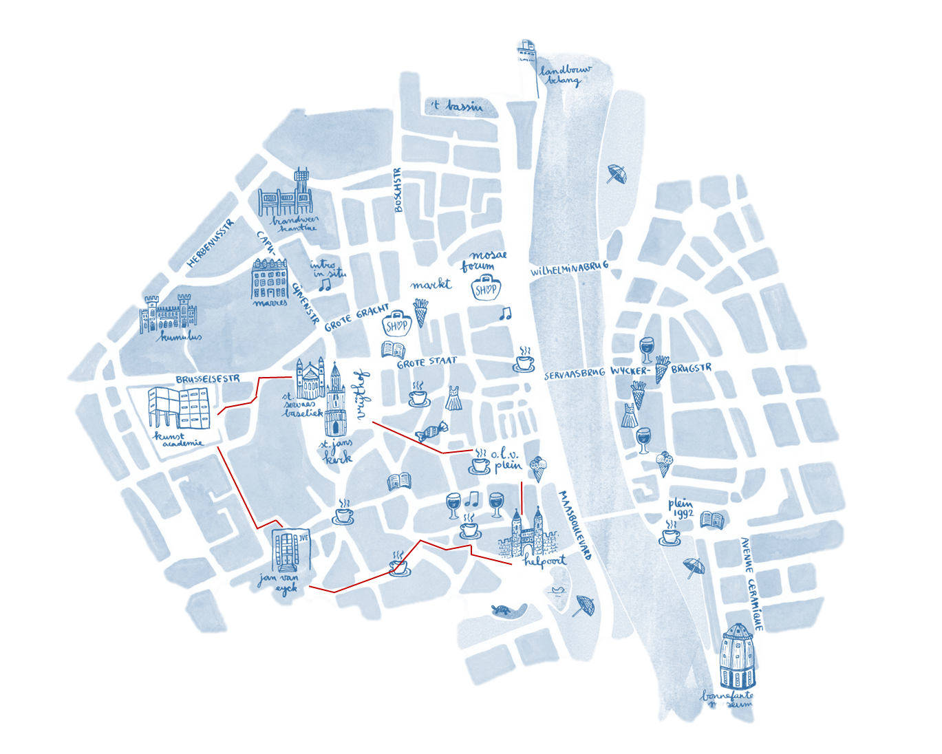 VB: netwerk van 4 bezienswaardigheden in Maastricht. De rode lijnen geven de snelste manier aan om alle attracties te bezoeken & weer terug te keren naar het startpunt.